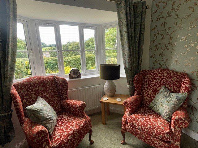 SITTING ROOM: A very gracious and calm room with two bay windows and a pedestrian door to outside, all enjoying views over the grounds and to the distant countryside and hills. Feature stone fireplace surround and hearth fitted with an attractive gas fire.
