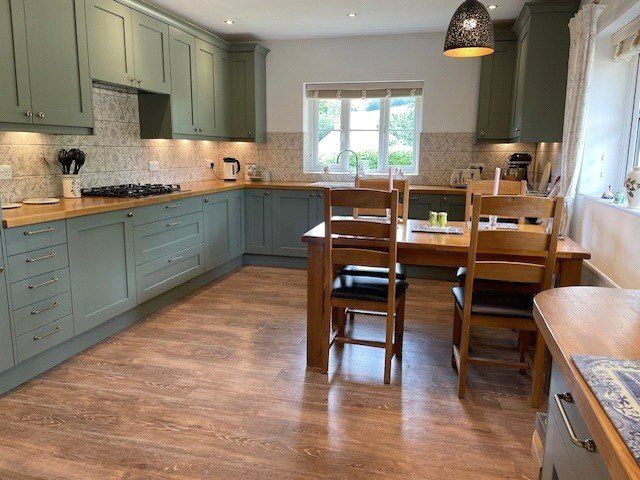 KITCHEN/DINING ROOM fitted with new Phase 3 kitchen affording an extensive range of wall and base cupboards and drawers with work surfaces incorporating a Villeroy and Boch ceramic one-and-a half bowl, single drainer sink unit with mixer tap and window over, large gas hob with cooker hood over and built-in oven and grill in cupboard housing together with integrated appliances. Space for good-sized dining table and chairs. Door to: