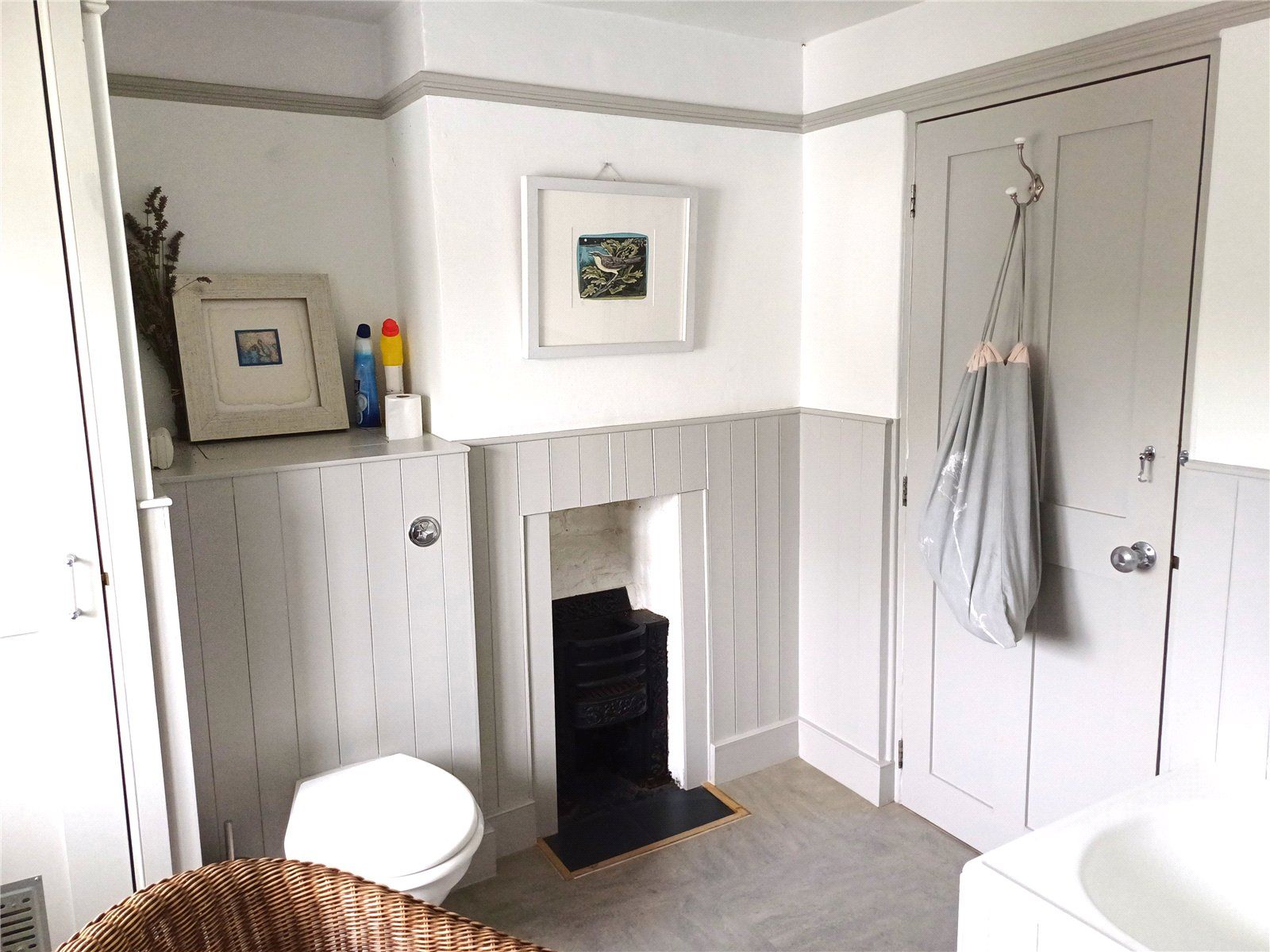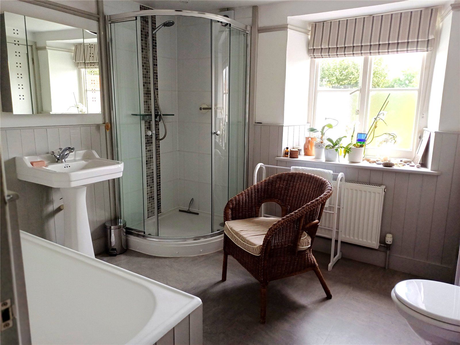 BATHROOM with modern suite comprising panelled bath with mixer and shower attachment, shower with decorative tiled central panel, pedestal basin and toilet. Airing cupboard housing the Vaillant gas-fired combi-boiler. Obscure-glazed window to the rear, extractor fan, fireplace feature. Part wood-panelled walls and picture rail.