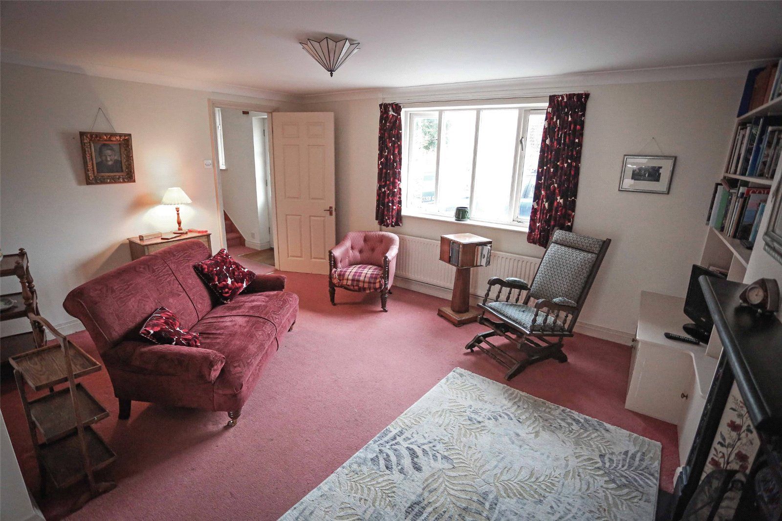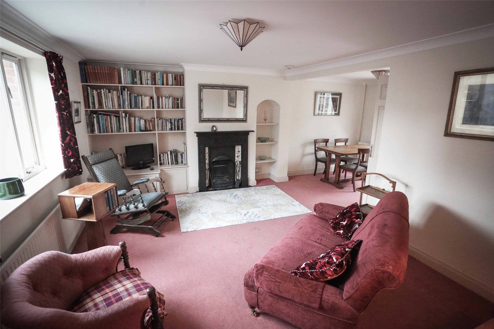 SITTING ROOM/DINING ROOM comprising a through room with window to the south, wrought iron fireplace surround with attractive tiled reveals and shelving either side and open fire, built-in double doored and shelved store cupboard and double doors opening into the: