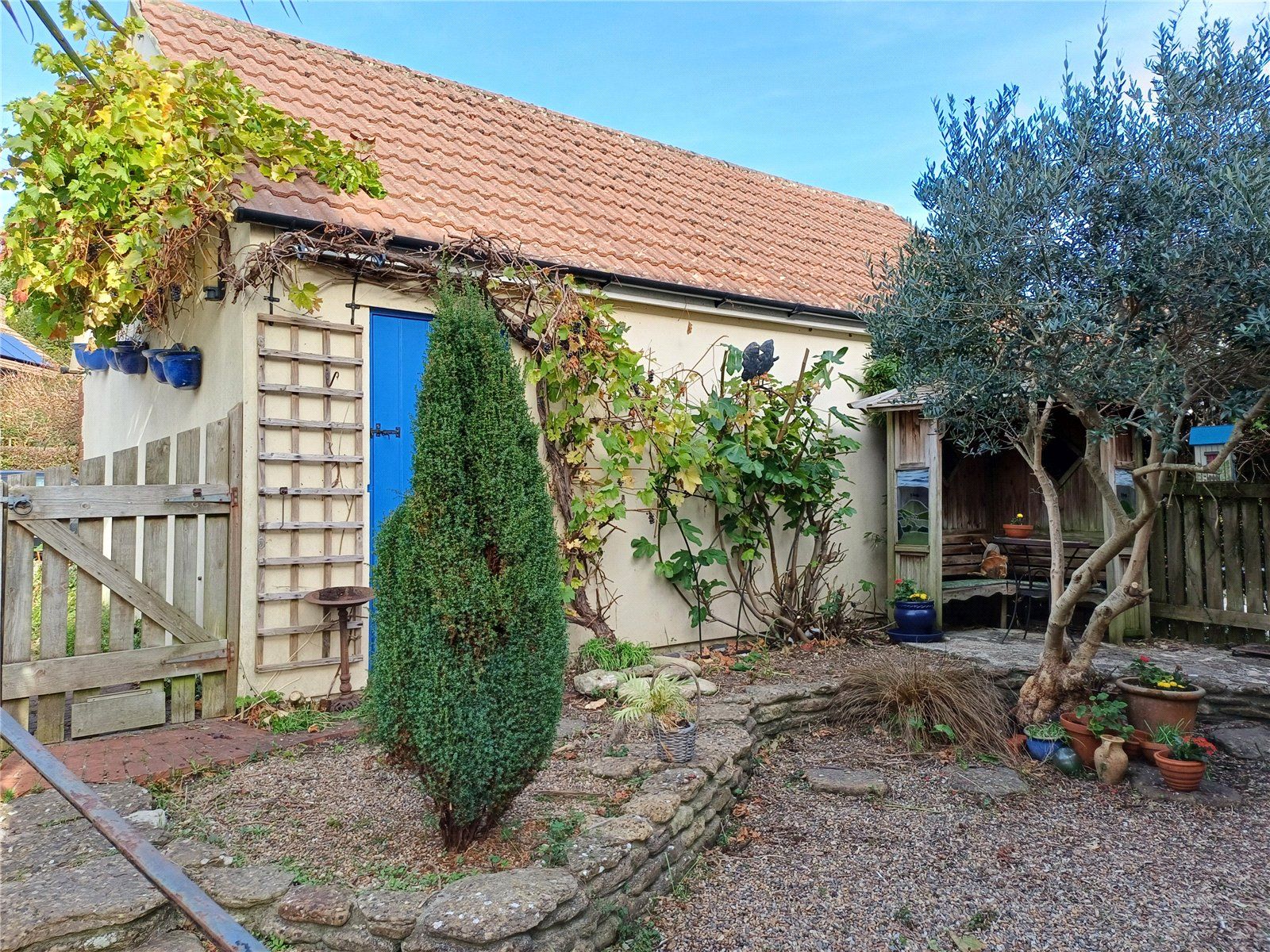 To the rear, is an interesting enclosed garden all hard landscaped creatively with slopes, paths, gravelled areas and dry stone walling, established bushes and small trees. Areas for sitting and contemplation are included. There is a wooden arbour in the corner also supporting climbing plants. There is a pedestrian door opening into the traditionally built SINGLE GARAGE with light and power connected and with an up-and-over door together with an adjacent PARKING SPACE.