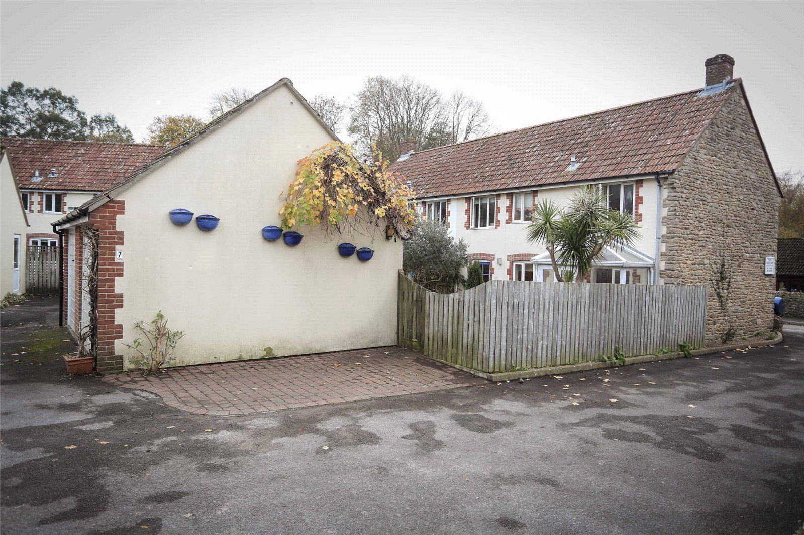 The front garden is contained by a low stone wall offering a small flower/shrub display area with pathway to the front door.