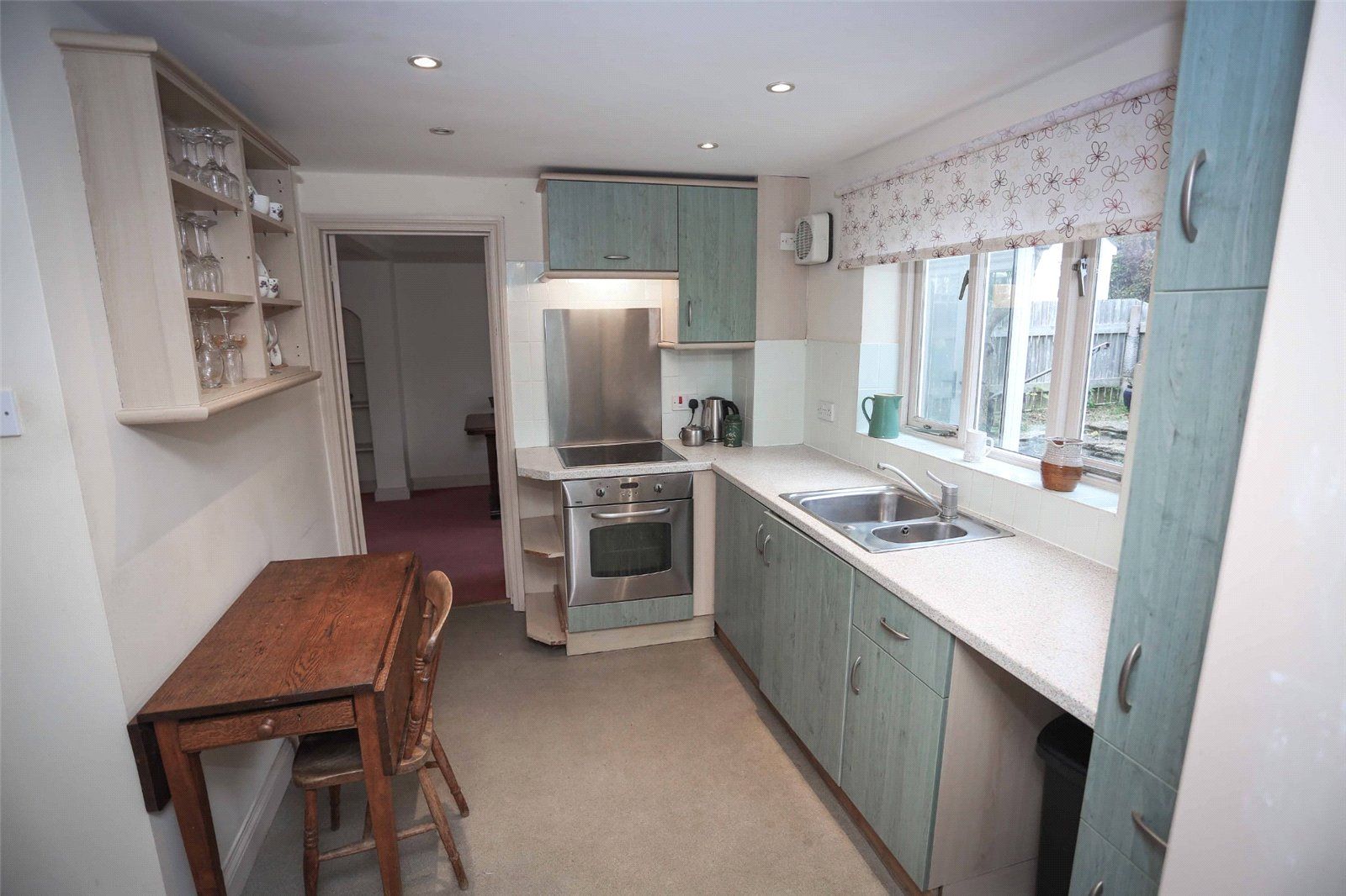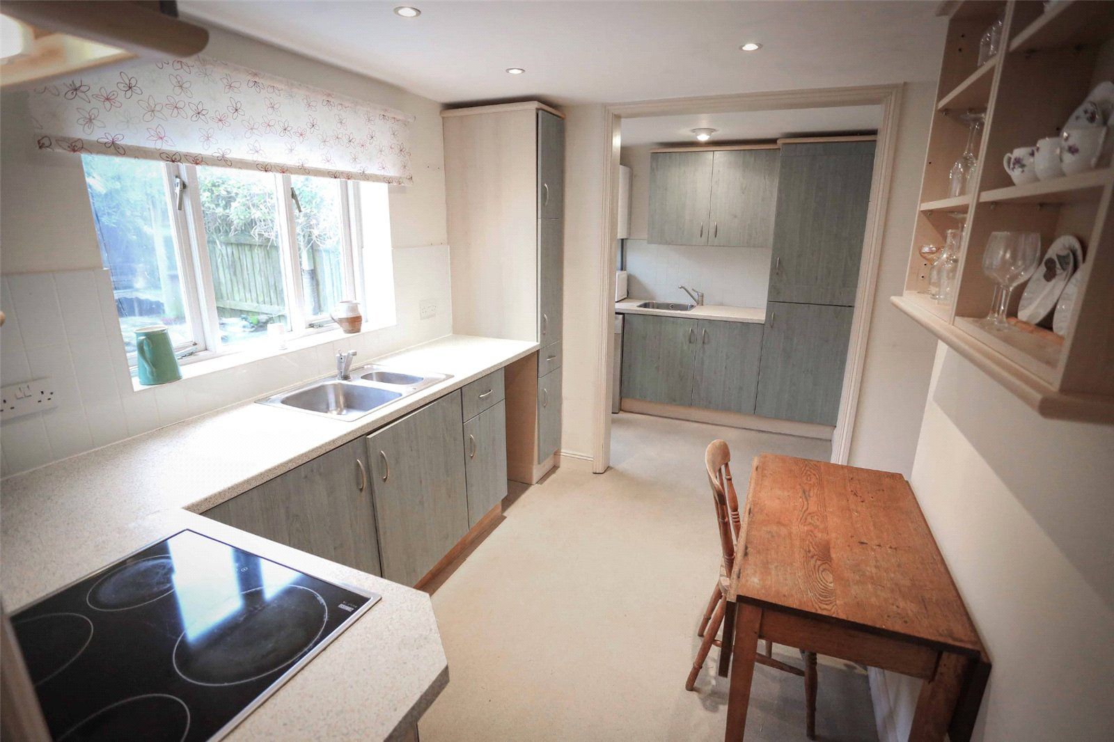 BREAKFAST KITCHEN: Comprehensive range of wall-mounted, base cupboards and drawers with work surfaces incorporating a one-and-a-half bowl sink unit with mixer tap with window over, built-in electric oven and hob over, pantry unit and built-in shelved larder cupboard. Wall mounted shelf unit. Wide archway through to: