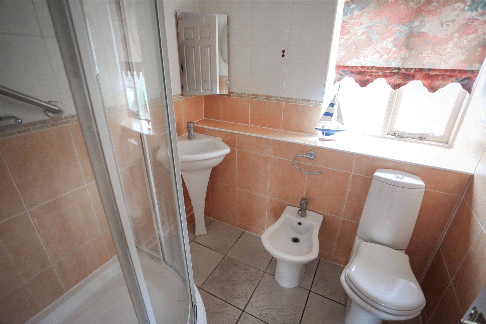 SHOWER ROOM with unusual, Italian-style modern suite comprising a shower cubicle, bidet, toilet and basin with mainly tiled surrounds. Window to the rear.