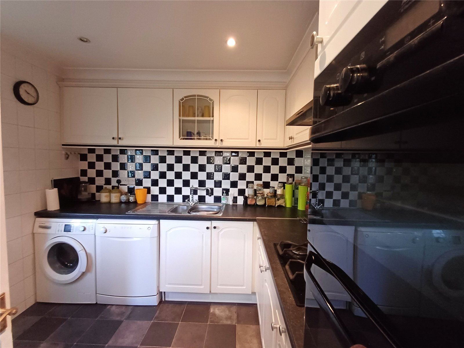 KITCHEN fitted with a comprehensive range of white units complimented with black work surfaces and black and white tiled splashbacks. There are base cupboards and drawers, a range of wall-mounted cupboards including a glazed display cabinet, built-in waist-height double oven/grill in cupboard housing, a gas hob with cooker hood over with work surface incorporating a one-and-a-half bowl single drainer sink unit with mixer tap, extending over plumbing for washing machine and dishwasher. Another work surface extends on the east wall with space for fridge and freezer under and a glazed double-doored wall cabinet above. Sunken ceiling downlighters, fully-tiled walls, attractive vinyl flooring, double glazed window pane and door to the outside side pathway.