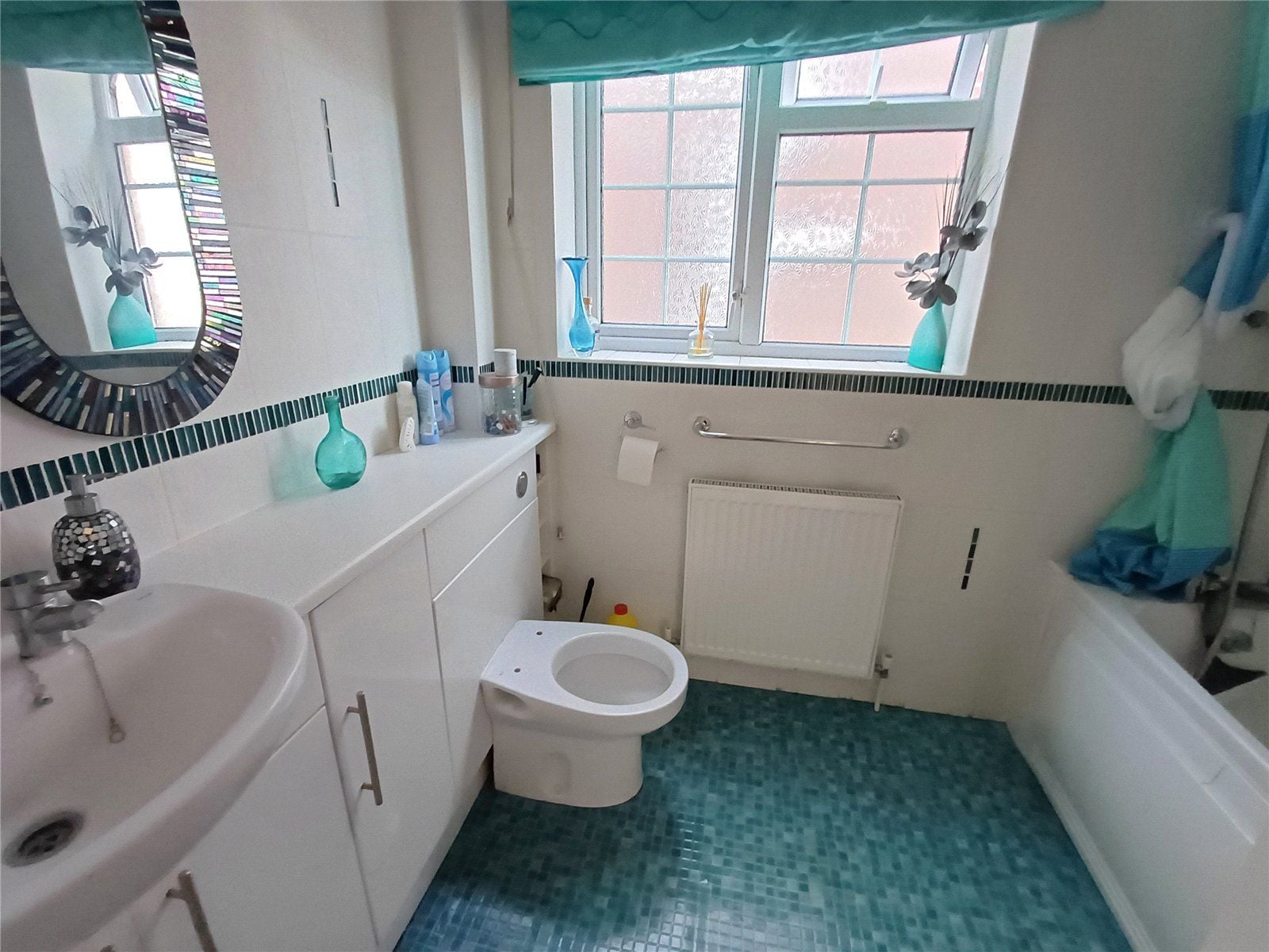 BATHROOM with white suite comprising a panelled bath with mixer tap and shower attachment, curtain rail and hand rail, pedestal basin and low level WC, with complimenting fully tiled walls and two high level glass display shelves and a towel rail over the radiator.