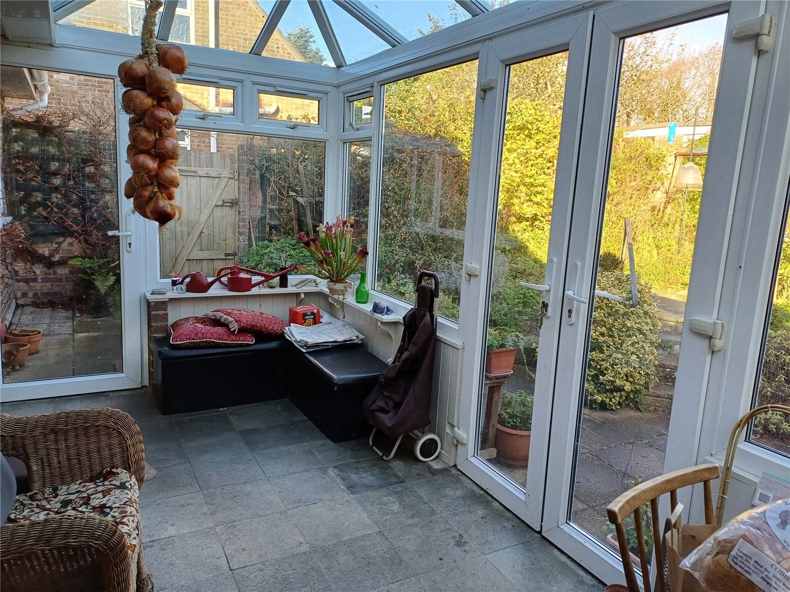 LARGE CONSERVATORY which extends to the rear and has a perspex shaped roof and provides a good sitting/dining area enjoying views over the secluded garden. Side door and double doors opening to the gardens.