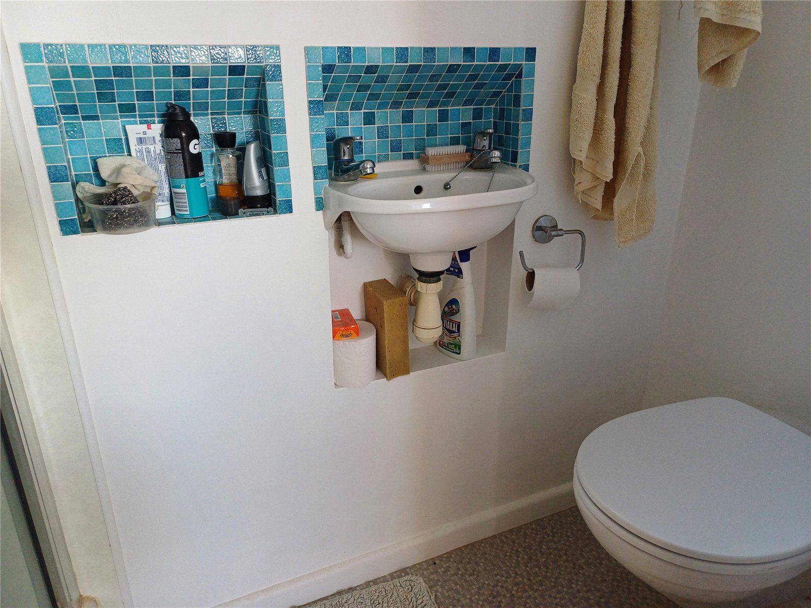SHOWER ROOM with shower cubicle and toilet. with window to the rear. There are two small-tiled niches, one fitted with a cosmetics shelf and the other fitted with a small basin.