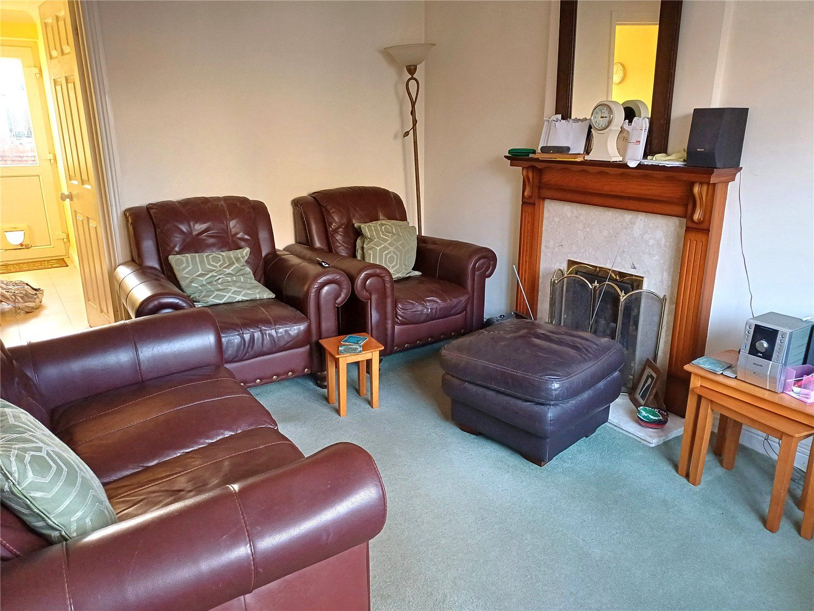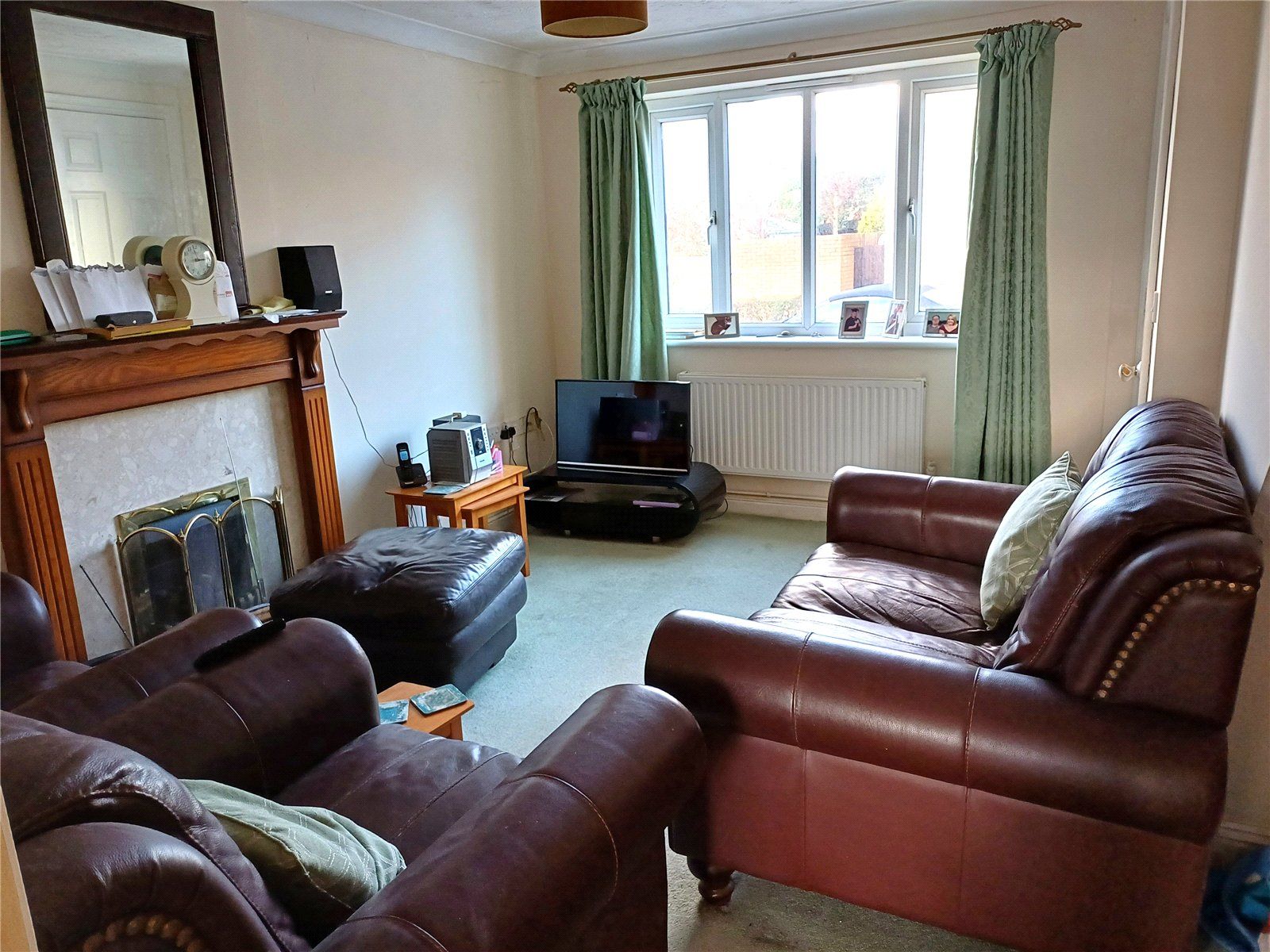 LOUNGE with window to the north overlooking the close and featuring an attractive fireplace with wooden surround, fitted with a coal-effect gas fire. Door to: