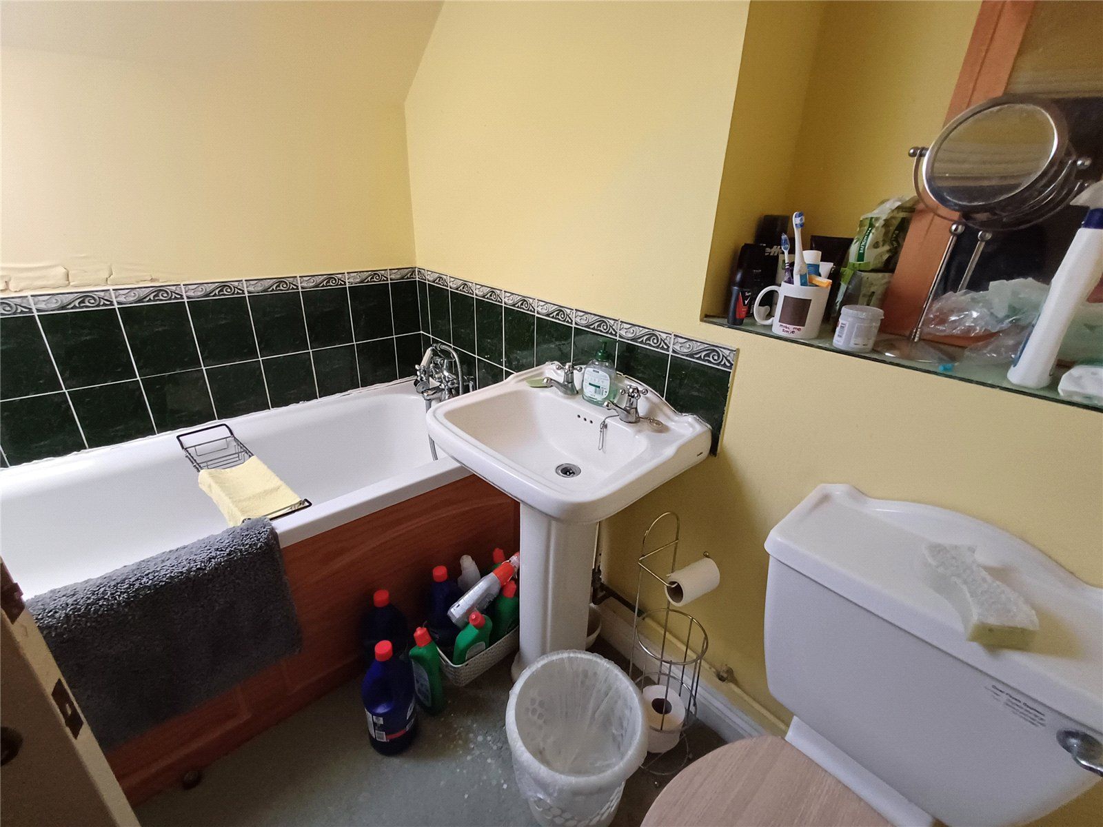 BATHROOM comprising a bath with mixer tap and shower attachment, pedestal basin and low level WC. Strip light/shaver point.
