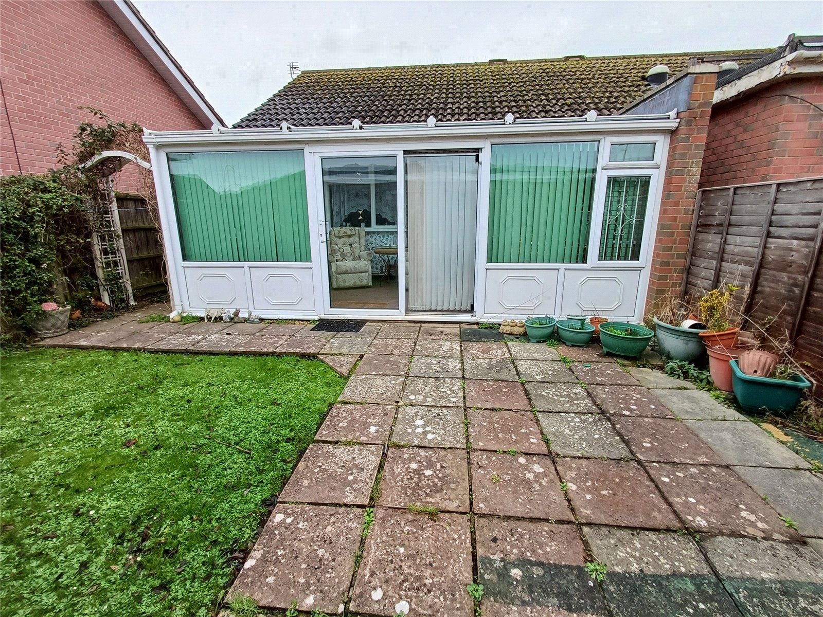 CONSERVATORY of mainly double-glazed construction under a glazed lean-to roof fitted with three electric blinds and faces east overlooking the small enclosed rear garden.