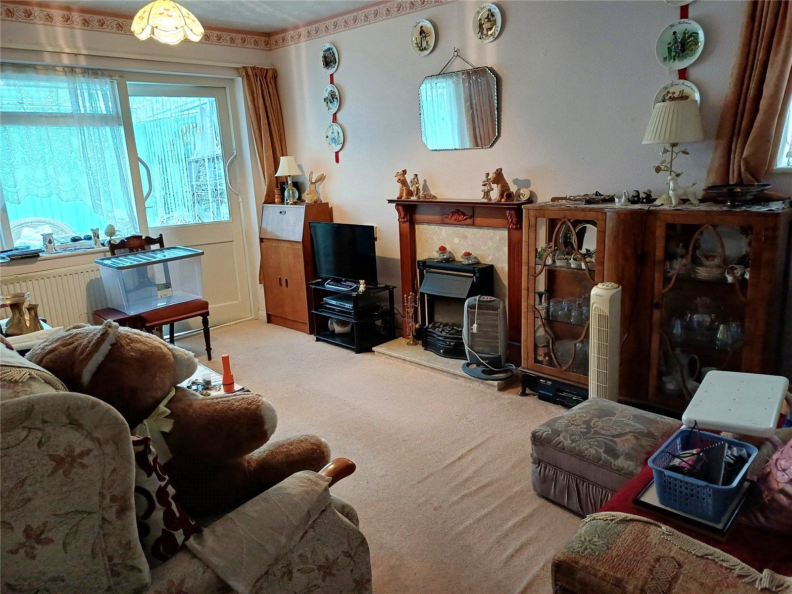 LOUNGE/DINING ROOM with coal-effect electric fire fitted in a wooden surround with marble-effect backing and plinth. Small side window. Window and door opening into the: