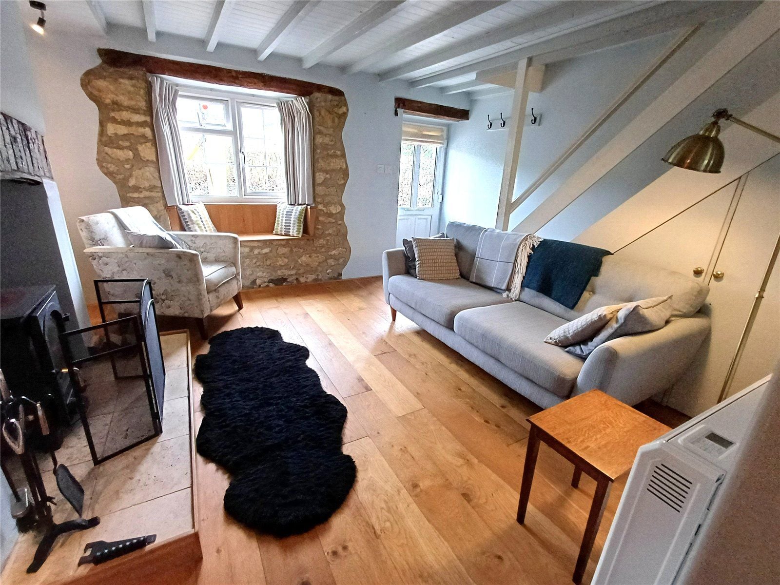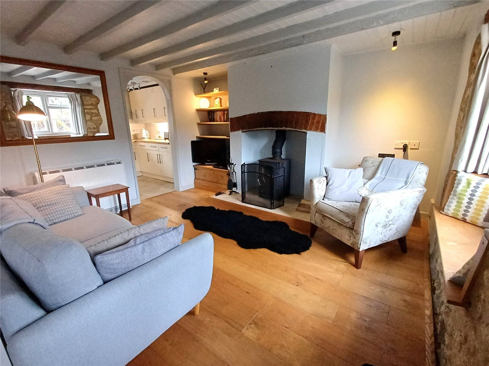 SITTING ROOM with fitted doormat and coat rack. Feature inset wood burner, with attractive arched brick head and raised hearth and deep shelved alcoves to the side. Front window with beam over, wooden window seat and shaped exposed stone reveal. Open staircase rising to the first floor with alcove below with mains operated light for display, exposed ceiling beams, engineered oak flooring. Shaped cupboard doors to understairs' storage. Arched architrave to: