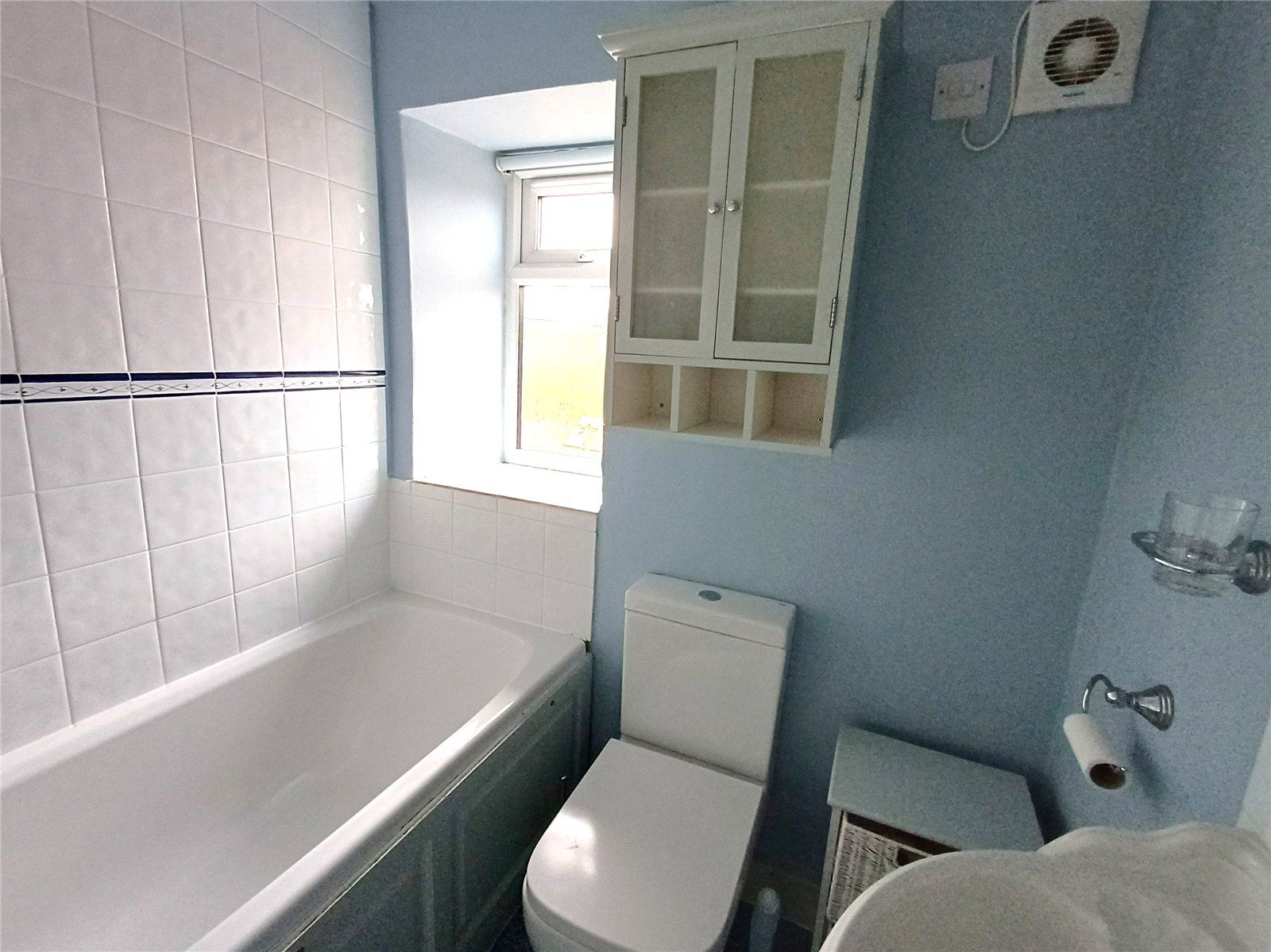 BATHROOM with white suite comprising bracket basin with shell-shaped soap holders with mirror and light/shaver point over, panelled bath with Mira self-heating shower unit over and WC. Tiled splashbacks, small radiator/towel rail. Deep sill to window.