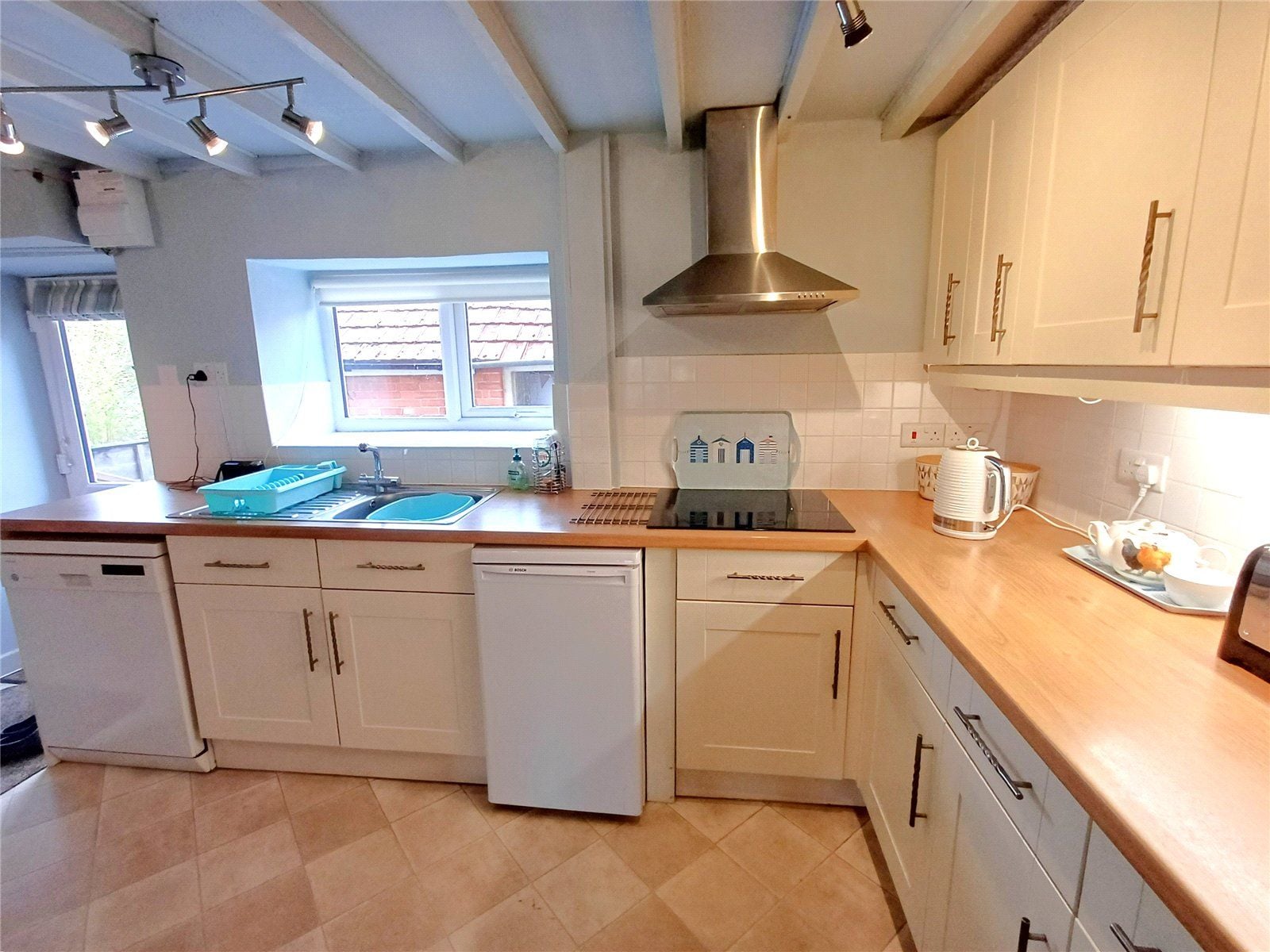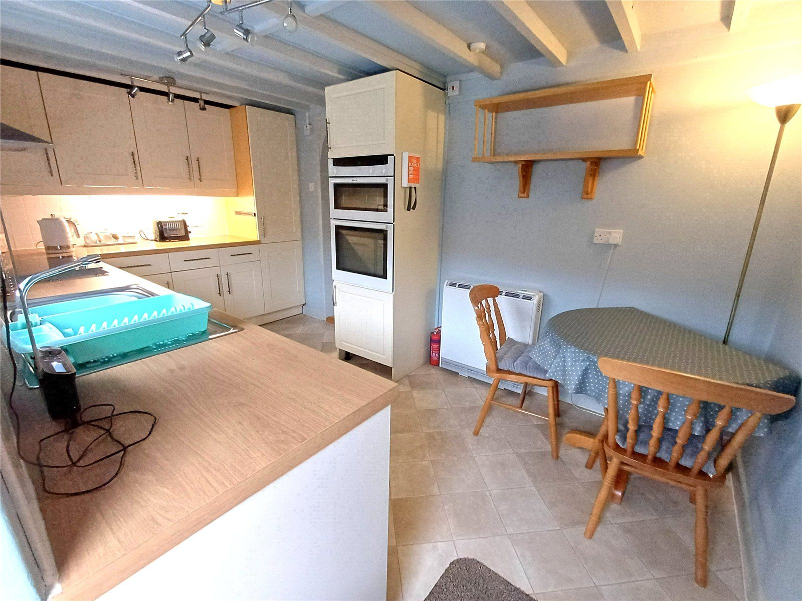 KITCHEN/DINING ROOM with contemporary range of kitchen units comprising base and wall cupboards and drawers with wooden worksurface incorporating a single drainer stainless steel sink unit with mixer tap, tiled splashbacks and deep sill to window above, induction hob with cooker hood over, dishwasher, built-in waist height oven and grill in cupboard housing, upright storage cupboard, under-unit lighting, two spotlight tracks, vinyl flooring. Space for dining table, Dimplex electric heater with timber shelf unit over. Back door to courtyard.
