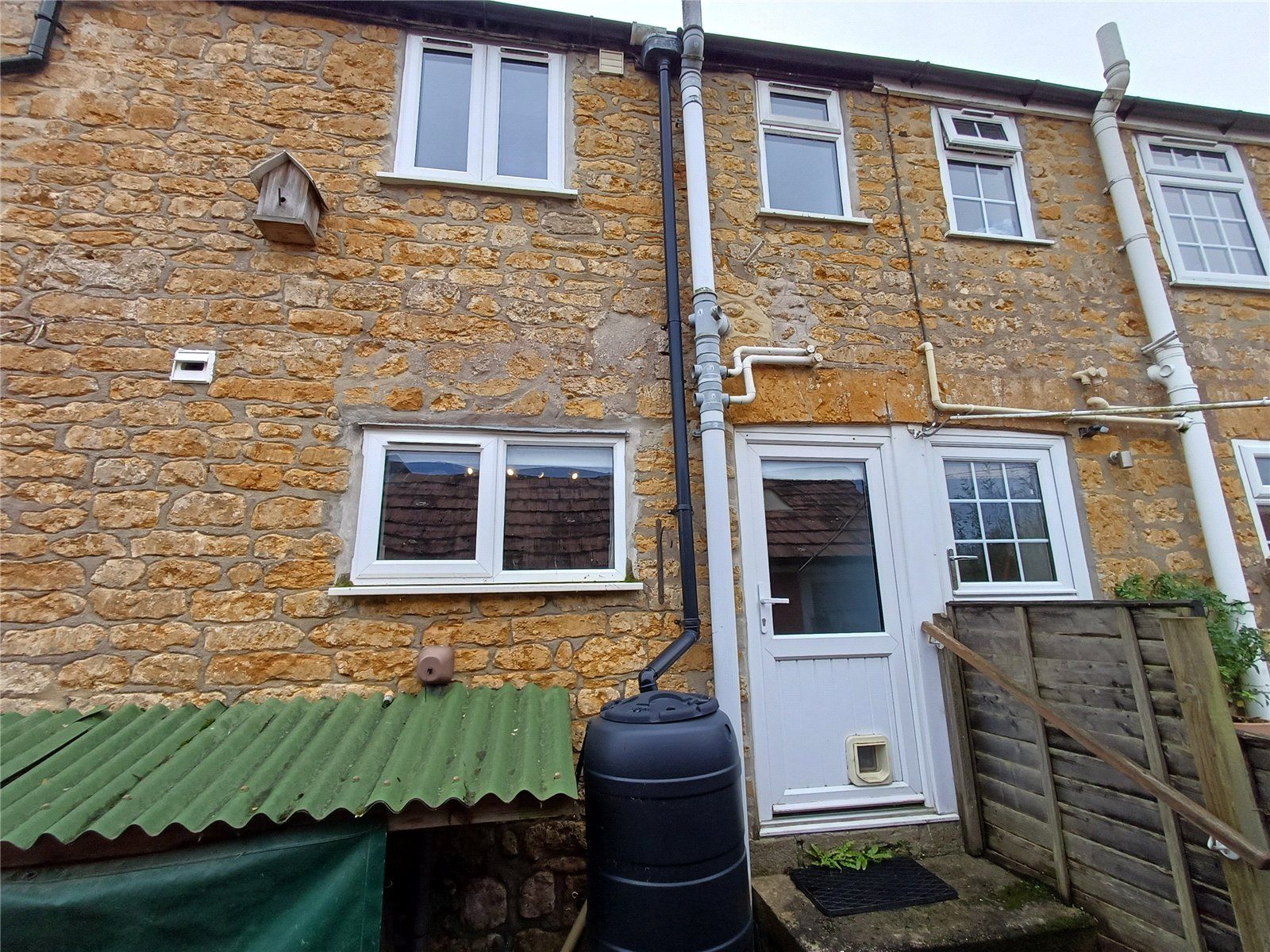 The part-glazed uPVC kitchen door opens to a small flight of stone steps with handrail which lead down to the small courtyard area immediately to the rear. Here there is a log store, rainwater butt and a low wooden-slat gate affording access over the adjoining cottages' yards and around the end of the terrace for the benefit of this cottage (no access rights into this rear yard).