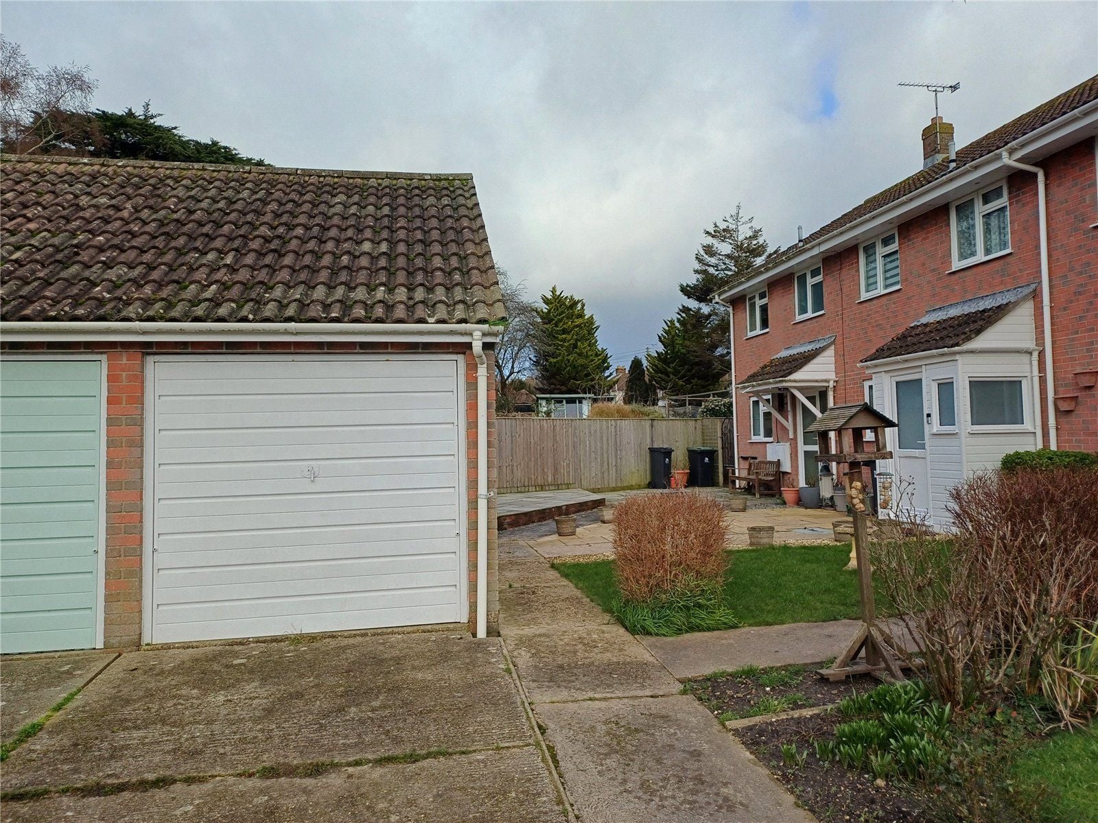 There is a SINGLE GARAGE which is one of a block of three which has a metal up-and-over door. There is a wedge-shaped hard-landscaped garden on two levels to the front.