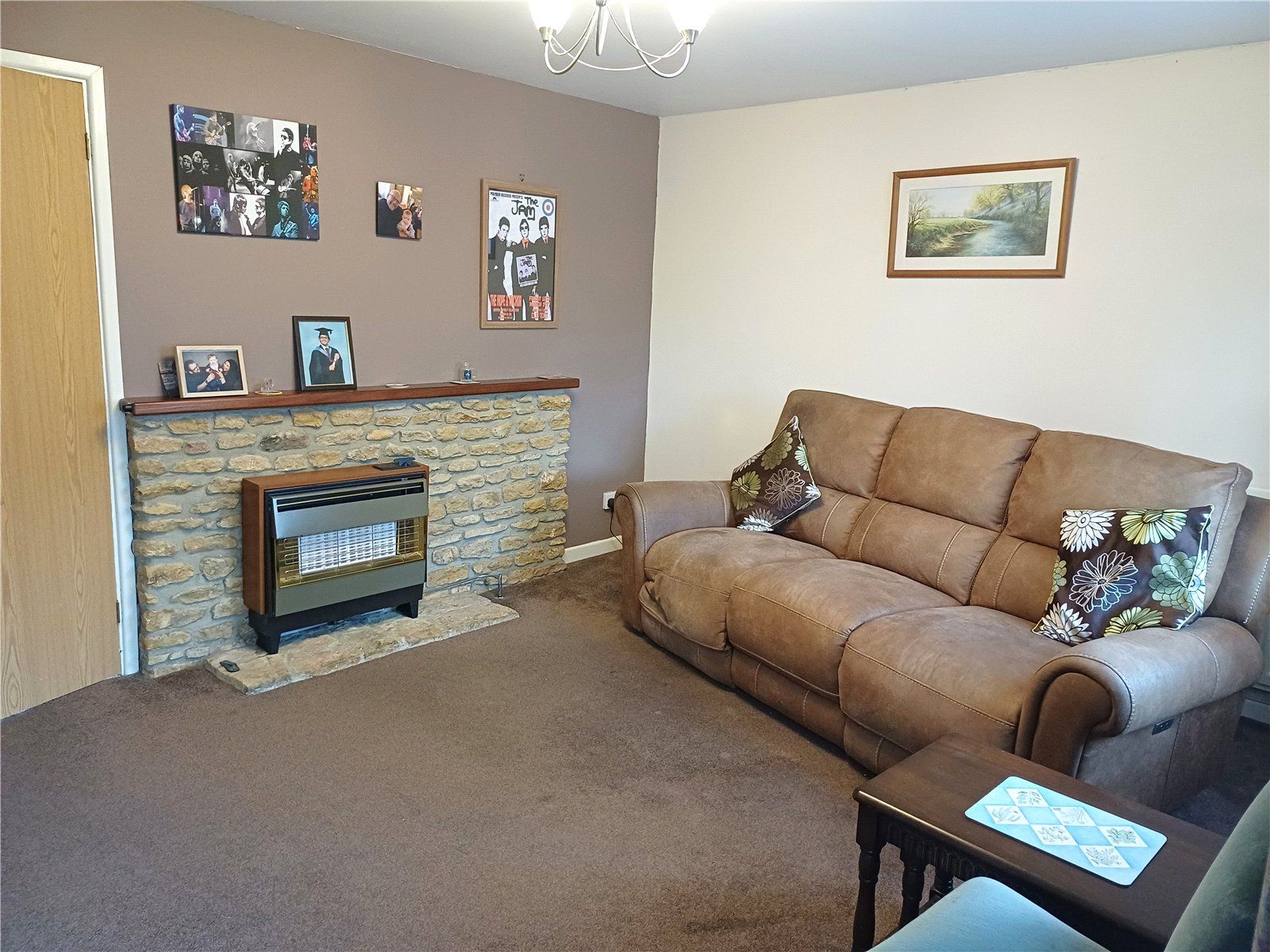 SITTING/DINING ROOM featuring a re-constituted stone fireplace surround with wooden mantel and stone paved hearth fitted with a gas fire. Doors to: