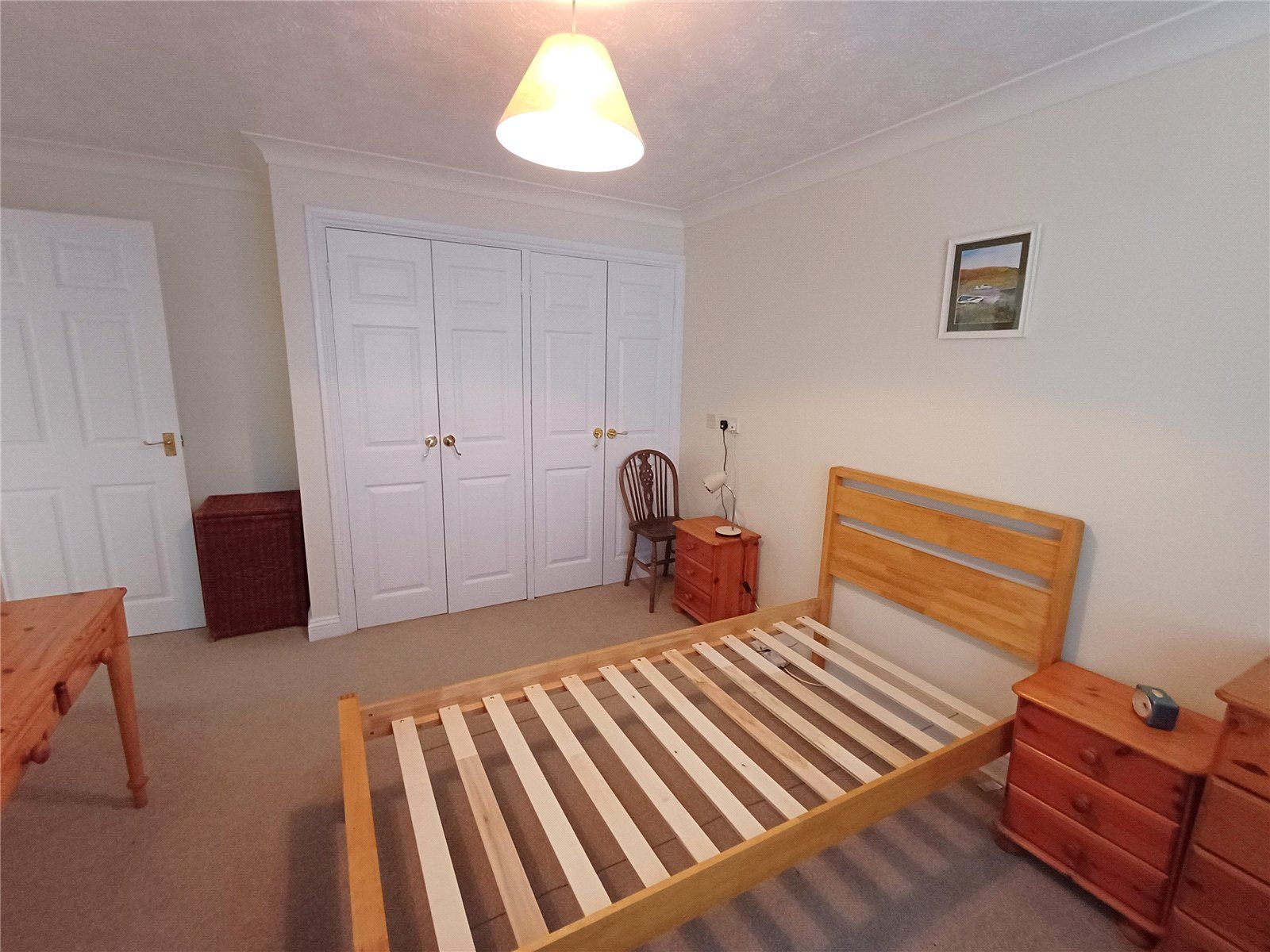 BEDROOM 1 with window to the front and his and hers double-doored wardrobe cupboards.