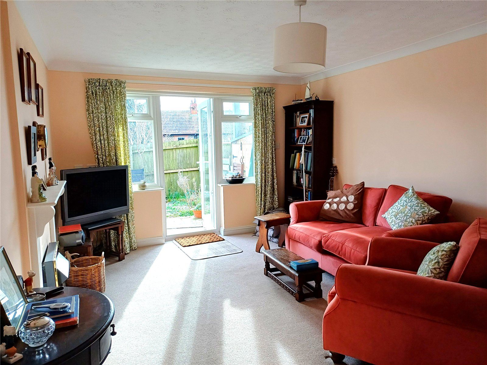 SITTING ROOM with window to the front aspect, electric fireplace feature and double-glazed French doors opening to the rear decked area and garden. Double, obscure-glazed doors open into the