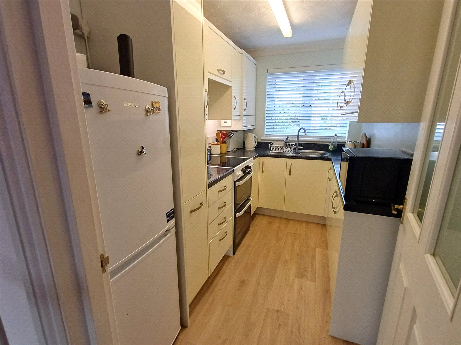 KITCHEN with modern fittings comprising wall-mounted cupboards, base cupboards and drawers with attractive work surfaces over and incorporating a singe drainer stainless steel sink unit with mixer tap, free-standing electric cooker with hood over, wall-mounted cupboard housing the Worcester mains gas combi-boiler, sliding out pantry cupboard, upright fridge/freezer space, under-unit lighting and concealed ceiling downlighters. Window overlooking the communal gardens to the front.