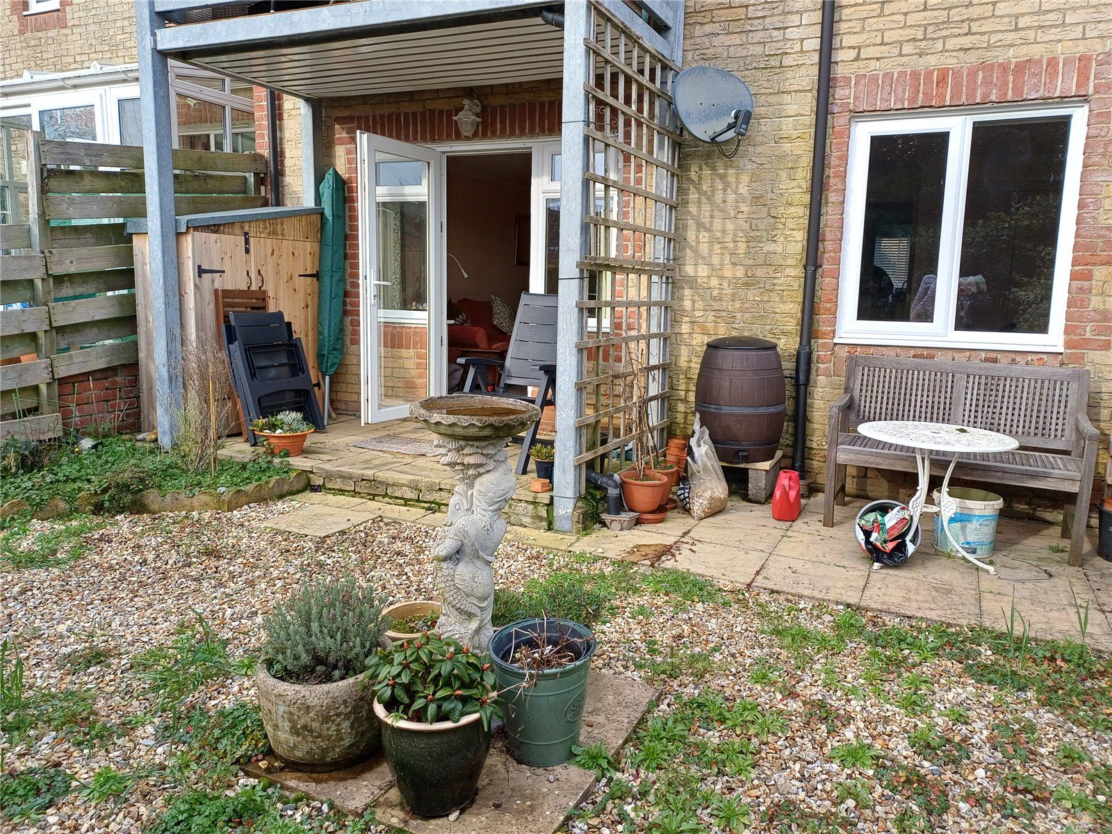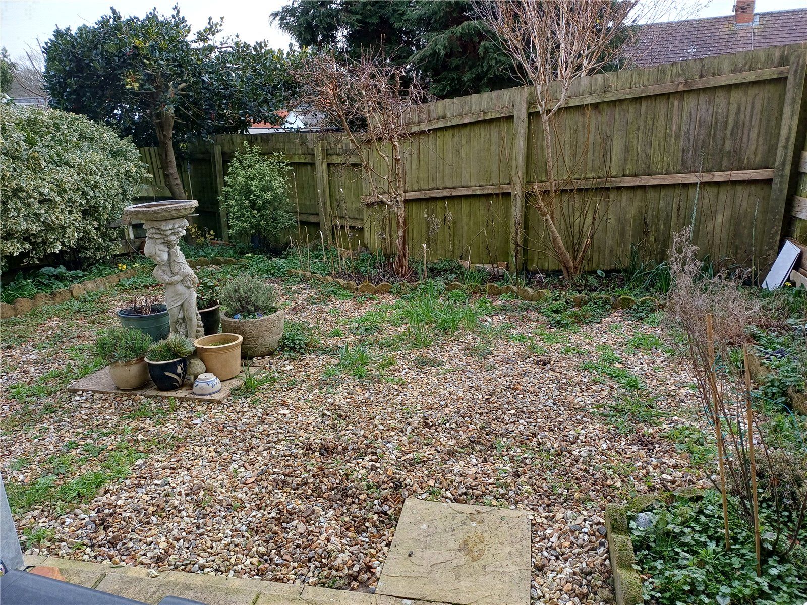 There is a south-facing garden enclosed by high wooden fencing exending to the rear, mainly providing a paved area for sitting out and then a gravelled area with bird bath/display areas with a shaped herbaceous border all well planted. There is a narrow wooden store shed also here.