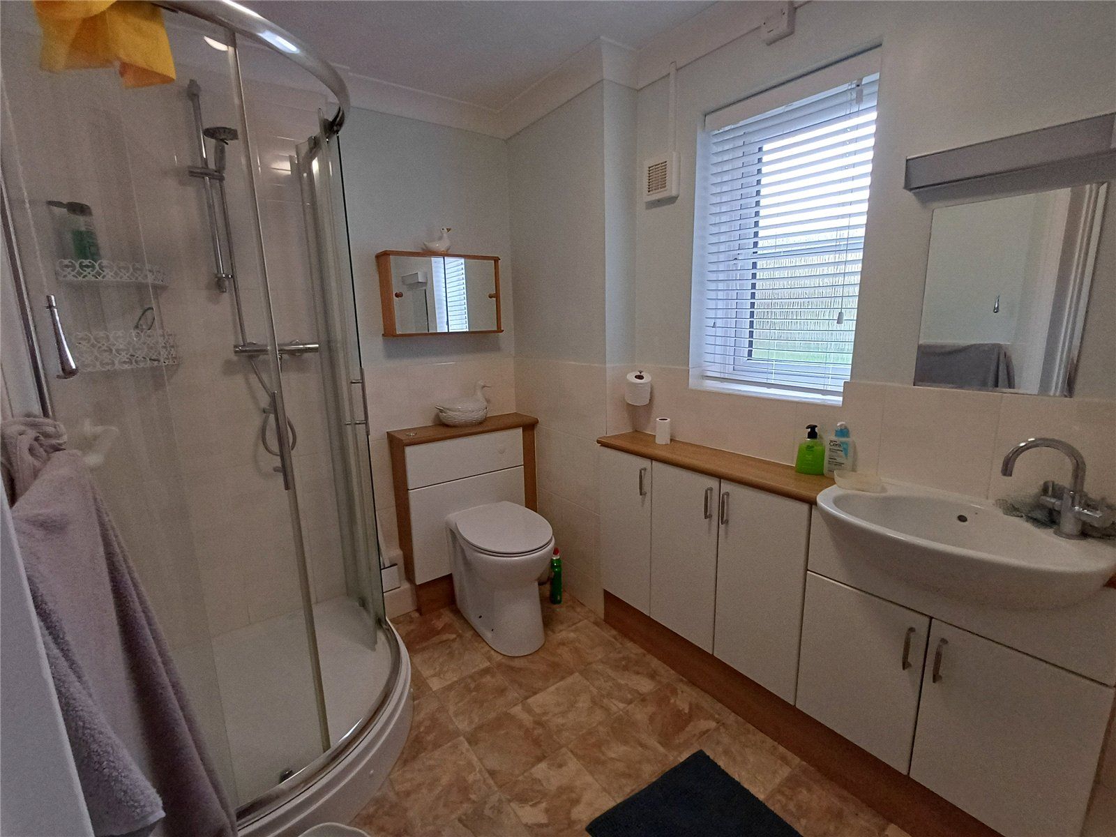 SHOWER ROOM recently refurbished with a modern suite comprising a corner shower, boxed in toilet in cupboard housing with shelf extending over. Half-tiled walls, extractor fan, attractive vinyl flooring to compliment, wall mirror over basin with strip light/shaver point over, obscure-glazed window to the side, upright towel rail/radiator.